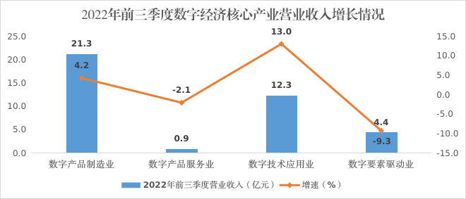 根据国家统计局印发的《数字经济及其核心产业统计分类(2021)》,数字经济核心产业分为数字产品制造业、数字产品服务业、数字技术应用业和数字要素驱动业四类。2022年前三季度,全市“四上”企业中,数字经济核心企业48家,占“四上”企业的3.3%。