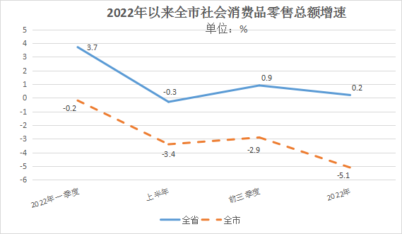 2022年,伴随着疫情多发,收入预期减弱,市场消费动力不足,全市消费总体偏弱,但绿色智能消费、网络零售等引领消费新热点,全市消费市场总体运行平稳。