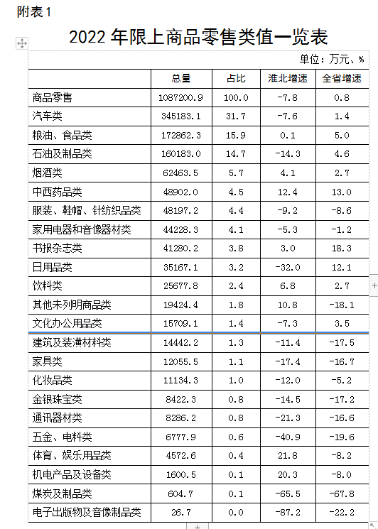 (一)大宗商品持续下滑,限上消费品结构不优。汽车和石油类商品占全市限上消费品零售额比重高达42.5%,消费品结构发展不均衡。2022年,汽车和石油类商品零售额同比下降9.7%,若剔除汽车和石油类下拉作用,则全市限上消费品零售额降幅将收窄1.4个百分点。2022年,部分升级类商品销售乏力,限上化妆品类、通讯器材类商品零售额同比分别下降12%、21.3%,增速分别低于全省平均水平6.8个、4.7个百分点。(详见附表1)